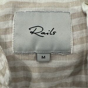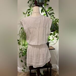 This is a Rails Angelina mini dress in the Dune Stripe color, made from a linen blend (55% linen, 45% rayon). Elegant tan and eggshell white lightweight go-to outfit. Photos cannot convey how comfortable this material is, a soft linen blend.