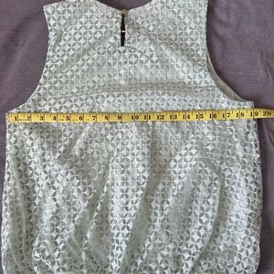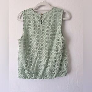 Soft and feminine sleeveless blouse in a beautiful pastel green shade. Features an allover lace overlay with a fully lined interior and a flattering bubble hem for a flowy, polished silhouette. Lightweight and comfortable—easy to dress up or down. Perfect for spring and summer wear, work outfits, brunch, casual outings, or special occasions.