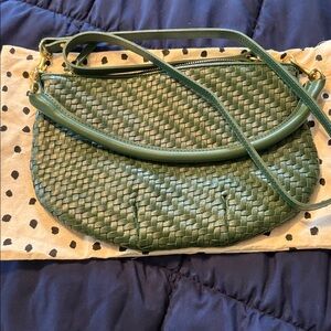 Stylish woven texture. Deep forest hue. Gold hardware accents. Comes with matching strap.