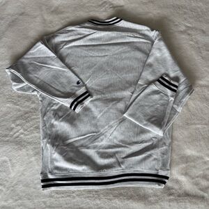 Light gray sweatshirt featuring black 'Princeton' and tiger graphic. Ribbed cuffs and collar with black stripes.