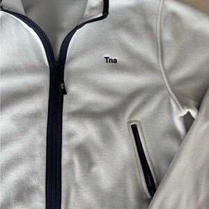 Aritzia TNA Light Blue Fleece Jacket with Navy Blue Trim