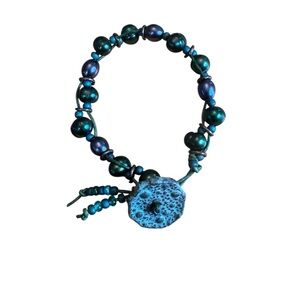 This stunning bracelet features freshwater seed beads and copper on a green distressed leather, evoking the beauty of ocean waters. A unique handmade ceramic charm adds a touch of elegance and intrigue to the piece. Perfect for adding a sophisticated touch to any ensemble.