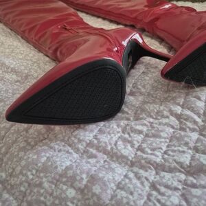 Sleek red over the knee boots. Shiny patent finish. Pointed toe and stiletto heel. Bold and stylish.