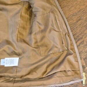 Cozy and stylish J.Crew faux fur vest — perfect for layering in cooler weather. Features a soft plush tan/camel faux fur exterior, full gold-tone zipper closure, two front zip pockets, and a smooth polyester lining for comfort.