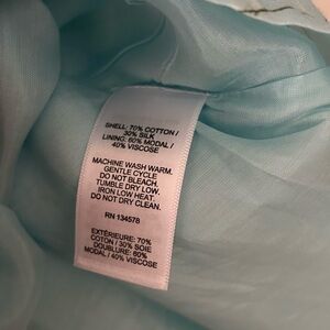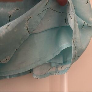 Charming sky blue blouse with ruffled front. Features subtle pattern and puff sleeves with smocked detail. Ideal for casual elegance. Cotton silk blend.