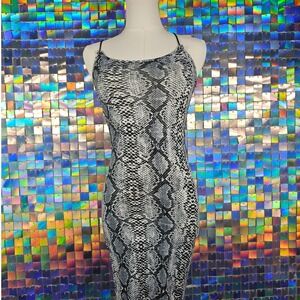 A striking snake print bodycon mini dress with spaghetti straps and a daring backless design featuring intricate criss-cross detailing. This dress contours the figure for a bold and alluring silhouette.