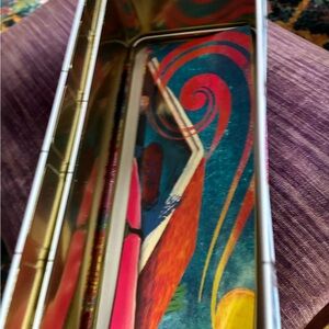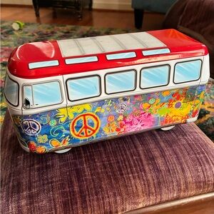 Colorful Volkswagen bus tin featuring a vibrant red top and blue accents. Perfect for collectors or as a decorative piece.
