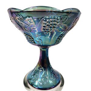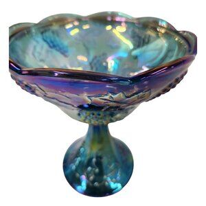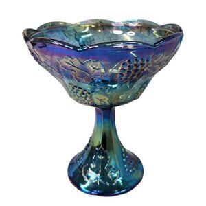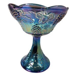 Vintage Indiana Iridescent Carnival Glass Grape Leaf Blue Compote Bowl Embossed