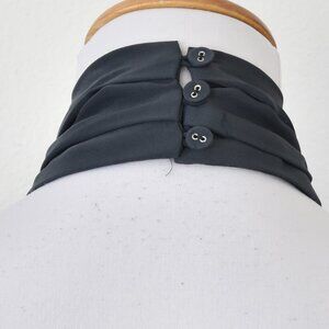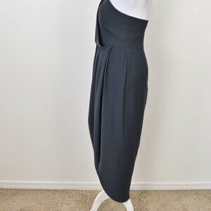 Buttons behind neck. Draped front. Halter style Tulip hem. Wrap style skirt. Skirt not lined, bodice lined. Gold colored back zipper. Midi length.