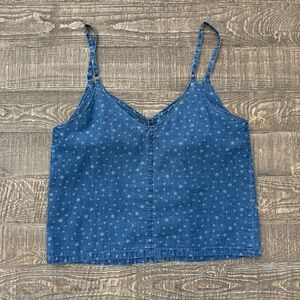 Chic blue denim tank with star pattern. Features adjustable straps and button front. Ideal for casual outings.