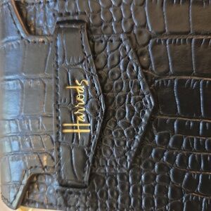 NWOT HARRODS of London, black leather embossed phone case with 42 inch gold chain, magnetic flap closure. 7x4x1.5.