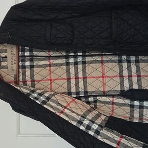 Elegant black quilted design. Features classic Burberry lining under cuffs, collar and inside of the coat. Perfect coat for layering in Spring/Fall/Winter.