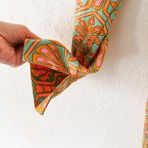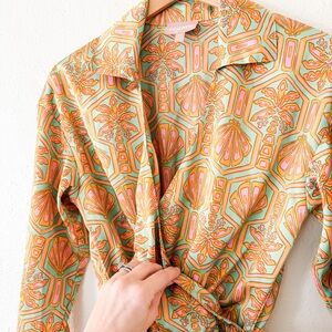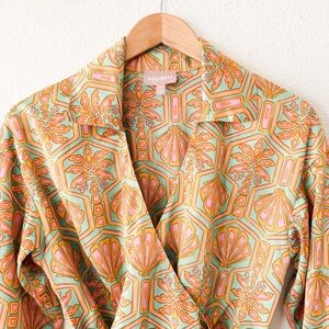 Color: Palm Deco. Satin fabric - 100% Polyester. Made in U.S.A. Dry clean recommended. Unlined. Pull-on styling with elastic waist. Semi-surplice styling with waist tie at skirt. Retails: $178