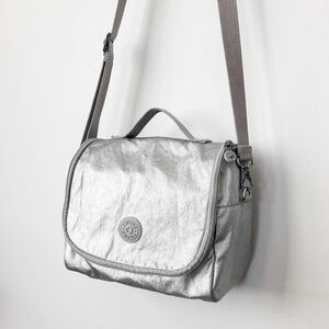 Amazing vintage Kipling silver shoulder bag. I believe that can be used as a camera bag, lunch bag, or a purse. Comes as shown and comes with a detachable arm strap. All zippers function as they should. Comes sanitized prior to shipping.