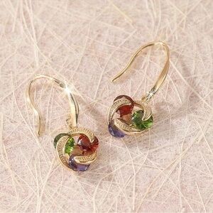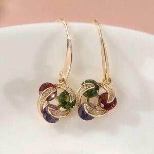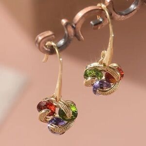 Add a touch of elegance with these stunning gold earrings featuring vibrant red, green, and purple crystals. Perfect for any occasion.
