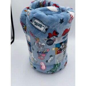 A cozy oversized plush throw blanket featuring classic Disney characters Mickey and Minnie Mouse and Pluto. This supersoft throw showcases a vibrant blue background adorned with various playful scenes of the beloved characters, including them enjoying popcorn and attending a movie. Perfect for snuggling on the couch during movie nights, adding a touch of Disney magic to a child's bedroom, or as a fun companion for outdoor adventures.