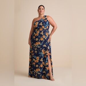 LULU’S Elegant Admiration Navy Blue Floral One Shoulder Maxi Dress