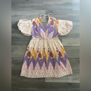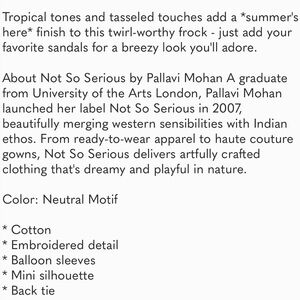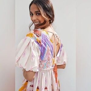 Gorgeous embroidered Not So Serious Share Abstract mini dress from Anthropologie. MSRP: $268. A bohemian showstopper from every angle! A base in tan/cream with colorful embroidery in purple, pink, yellow, blue and brown. Puff/balloon sleeves with an adjustable back tie that is finished in fluffy tassels. Hidden back zipper + clasp closure. Size XS: please see photo section for fit reference. Material: 100% cotton.