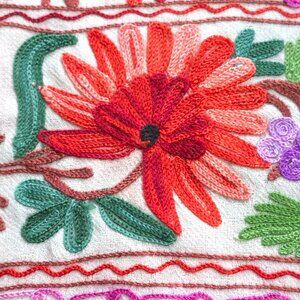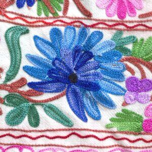 Beautifully embellished with chain-stitch embroidery, this wool scarf has colorful flowers all over. The scarf material is fairly lightweight, but the embroidery gives it a little weight. In near-perfect condition save one tiny mark on the bottom (see photo with toothpick). No pet hair. No odor. No pilling.