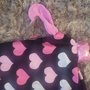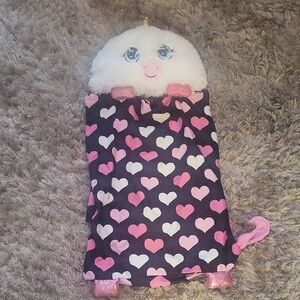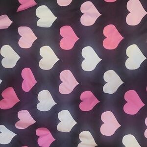 Charming plush toy featuring a heart pattern. Black background with pink and white hearts. Ideal for snuggling.