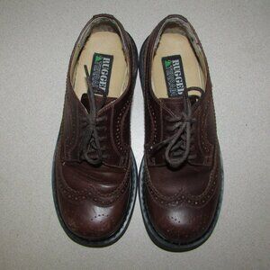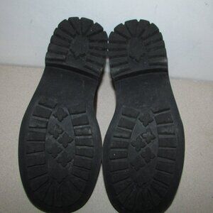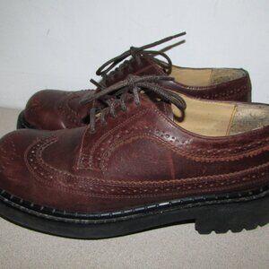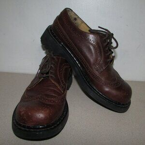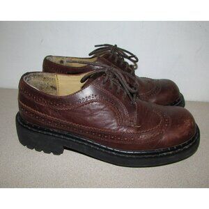 Women’s heavy duty lug sole lace-up shoes Brown leather upper with decorative oxford detailing Derby (open-lacing), or oxford style Rounded toe Heavy duty black lug sole with tons of tread - excellent condition Heel is approx 1 1/2" with 1/2" raised toe front platform Marked size 7 1/2 , EUR 38 (sized smaller than this - I am a 7.5 and they are too tight with light wool socks - would say more like a 6.5) Preowned with some minor scuffs - see photos - otherwise, excellent!
