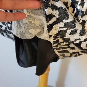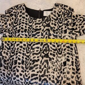 Leopard printed short sleeve sequin shift dress, fully lined with exposed back zipper. There is one little area that missing sequins as pictured.