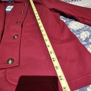 Stylish dark red blazer with double-breasted, military style design. Features gold-tone buttons and structured shoulders with side pockets. Ideal for a polished look. NWT, size large. See pics for measurements. Comes from smoke-free home. Thank you for looking.