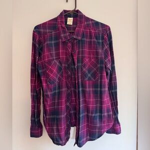 Set of three plaid button-up shirts. Includes red, black, and purple designs. Perfect for casual wear and all in great condition.