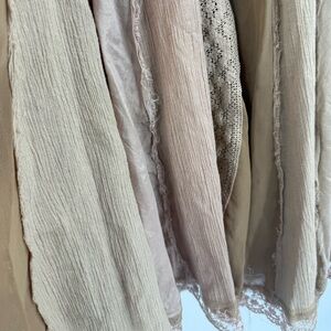 A true 1990s treasures, this mixed-media gypsy skirt embodies romantic darkness and artisanal detail. Layered panels of gauze, lace, and soft cotton create dramatic movement with every step. Earthy brown tones and raw ruffle textures make this a statement piece for whimsigoth, witchy, and bohemian wardrobes—rare, expressive, and impossible to replicate.
