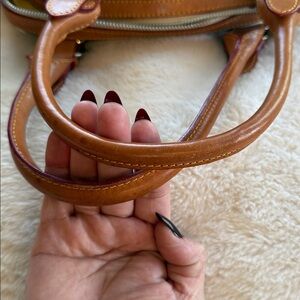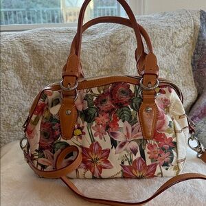 Beautiful soft leather purse with very little signs of use. I HATE letting go of this bag but I never use it and must get rid of all my bags. I hope someone loves this bag as much as I do. I remember getting so many compliments on it. Has a couple of water spots on leather handles as shown in pics and includes a long crossbody strap. This bag is the absolute perfect size. Very roomy but not large. Gorgeous floral design. Has silver hardware