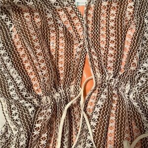 Chic textured knit top by Very J. Features intricate patterns in brown and white. See through- wear something underneath