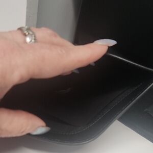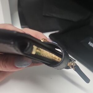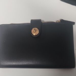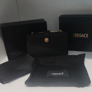The Versace compact wallet with coin purse is a luxurious accessory crafted from black calfskin leather. Made in Italy, this stylish wallet is designed for women and features convenient credit card slots. With its authentic Versace branding, this wallet is a chic yet functional addition to any handbag or purse, perfect for storing essentials while on the go.