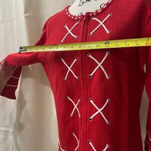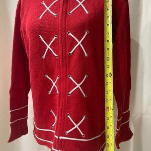 a delightful addition to any fashion-forward wardrobe. In a striking red with crisp white accents, this size small cardigan promises not only comfort but also a touch of playful elegance. Crafted with a comfortable knit material, it stands out with its unique white criss-cross lacing detail that cascades down the front, providing a visually engaging contrast that's sure to garner compliments. The neckline further features white trim detailing that complements the lacing design, while the hem and cuffs boast a matching white stripe, accentuating the garment's overall harmony of colors. This cardigan closes conveniently with a row of subtle eyelets and hooks, which preserve the sweater's sleek appearance.