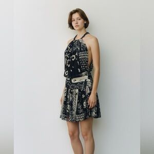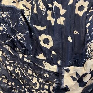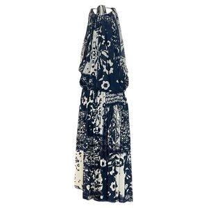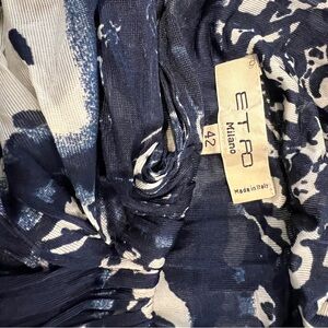 This is a preowned in mint condition, Etro bue and white halter neck midi dress with floral in size 42. Missing material tag, it is viscose / rayon frabic. It has a blouson bodice, a smocked ruched waist and a flowing pleated skirt. Measurement: Shoulder 15. " chest 34 " waist 26" length 44"