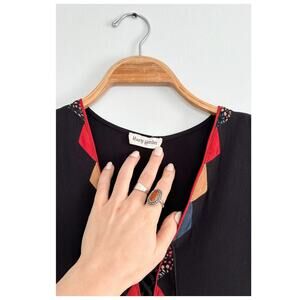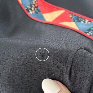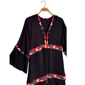 HOW TO STYLE/DETAILS: vintage Inspired dress by Liberty Garden! Features a red, tan and blue faux suede patch trim, v-neck with lace up front that has long, knotted strings which are embellished with a moon charm and star charm. Elbow length sleeves that flare out, slight rounded hem that is slightly shorter in the front and slits on the sides. Pull-on style. *see images wit circled spot that has been mended. not super noticeable!
