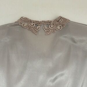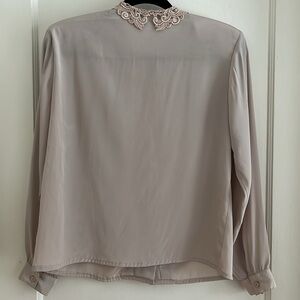 Vintage Tan Embroidered Collar Pleated Front Hidden Button Down Blouse 8P