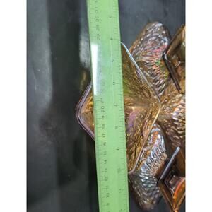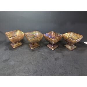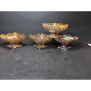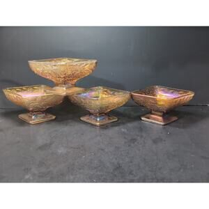 The Vintage Indiana Amber Carnival Glass Bowl set is a stunning homage to classic glass artistry. These pedestal dessert bowls, each exquisitely crafted into a diamond shape, captivate with their iridescent glow, embodying the nostalgia and charm of collectible glass. Designed to elevate any dining experience, this set of 4 bowls transforms everyday dessert serving into a regal affair. The amber hue dances with light, reminiscent of a sunset captured forever in glass, inviting both the eye and the imagination. Ideal for collectors and vintage aficionados alike, these bowls are more than just glassware; they're a tangible piece of history. Whether displayed as a centerpiece or used for shared sweet moments, let these enchanting bowls be the crowning jewels of your glassware collection.