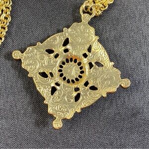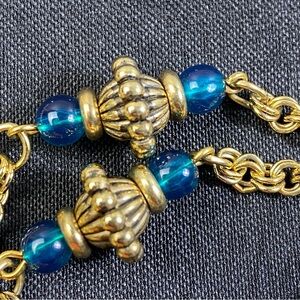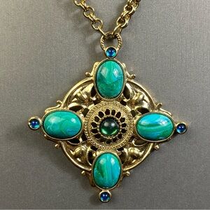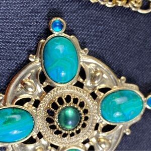 Vintage 1928 Chain Necklace Gold Tone Faux Pearl & Blue Green Cabochons 28"