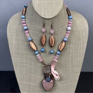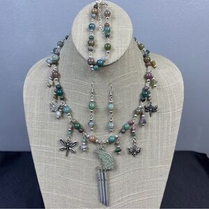 The cabochons are acrylic/plastic. The only glass stones are the small blue/green ones. The pendant is just about 2.5" long. The chain is 27.25" long. Good color and tone to the finish. No issues found.