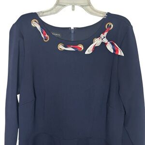 Polished, classic, and effortlessly wearable, this Talbots navy midi dress is a timeless wardrobe staple with a chic nautical twist. Featuring gold grommet accents at the neckline with a removable red, white, and blue scarf detail, this dress offers versatile styling—wear it with or without the scarf for different looks.