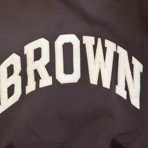 Authentic Champion Brown University crewneck sweatshirt, size XL, classic dark brown with stitched “BROWN” lettering and embroidered Champion logo on sleeve. Solid, cozy, well-made—emotionally complicated.