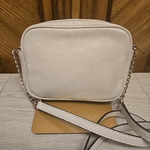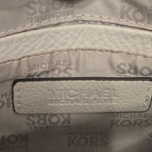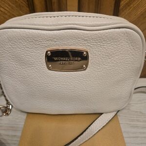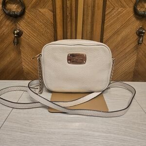 This Michael Kors Hamilton Small Crossbody Bag is in good preowned condition with a few scratches in the gold name plate, shown in pics. It has off-white pebbled leather with polished gold tone hardware. Lined signature fabric interior with open slip pocket and 4 card lots. Zippered top closure with Michael Kors engraved gold nameplate on the front, attached crossbody strap in same off-white leather and gold chain with a drop of 23".