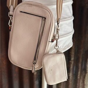 Beautiful Kate Spade New York leather crossbody bag in a soft cream color. Features an adjustable wide striped fabric strap and a matching removable mini zip pouch attached for extra storage. Finished with gold-tone hardware and zip closure.