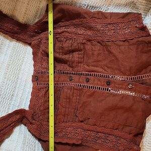 Reposhing this item I purchased from @florendascloset. Loved it, but it just doesn't work on my body type. Still new condition without tags. Beautiful chestnut brown color. Very comfortable fabric--viscose/linen blend, lace is cotton.