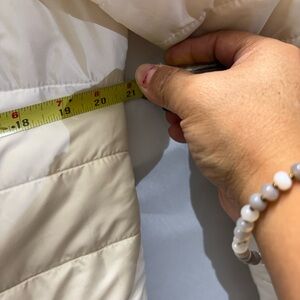 Elegant ivory puffer coat with quilted design. Features a cozy hood and full zip closure. Ideal for cold weather.
