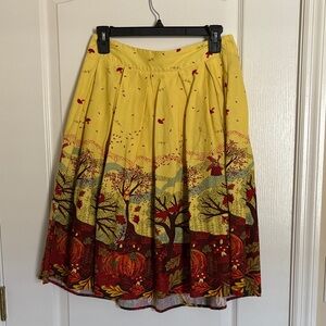 Charming A-line skirt with a scenic design. Features vibrant yellow and red hues. Perfect for a stylish look.