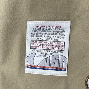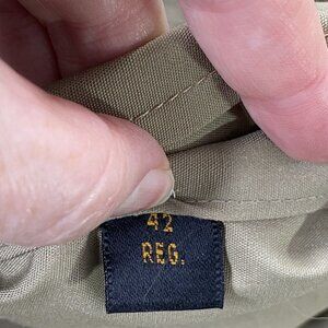The coat is water-resistant and has a size of 42R. It comes in a solid brown khaki color and has a spread collar style. The coat's features include a long jacket/coat length and a regular fit, perfect for any occasion, be it travel, party/cocktail, casual, formal, or business. The Andhurst trench coat is a USA-made product with a 90s preppy style that can be personalized if desired.