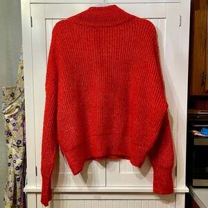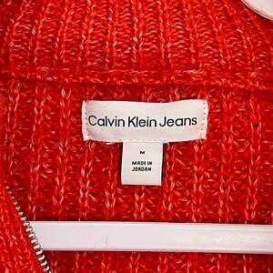 Calvin Klein Jeans Ribbed Quarter-Zip Knit Sweater in a vibrant red, Women's Size Medium. This stylish piece features a cozy chunky knit texture and a functional 1/4 zip neckline.