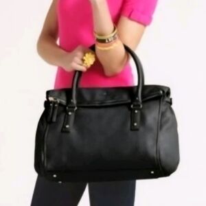 Elegant black leather satchel. Features dual handles and zip as well as snap closure. Perfect for everyday use.