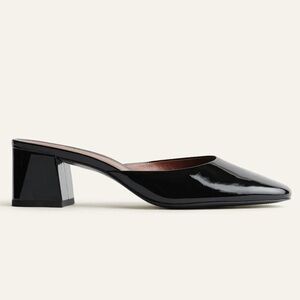 Sleek black patent leather heels. Block heel design. Slip-on style.